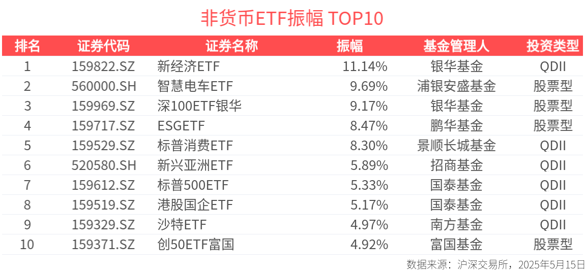 截至今日收盘,新经济ETF、智慧电车ETF、深100ETF银华振幅居市场前列,分别达11.14%、9.69%、9.17%。