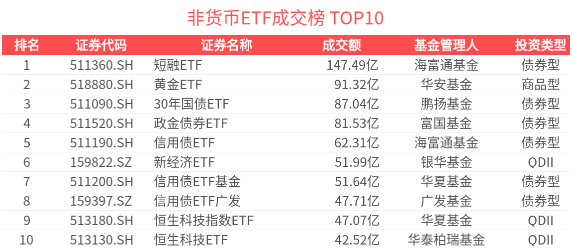 截至今日收盘,短融ETF、黄金ETF、30年国债ETF成交额居市场前列,分别达147.49亿、91.32亿、87.04亿。行业主题类ETF共计3只,分别是新经济ETF、恒生科技指数ETF、恒生科技ETF。