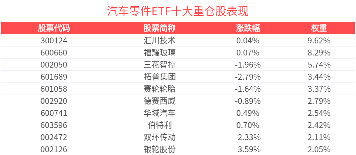 汽车零件ETF紧密跟踪中证汽车零部件主题指数,中证汽车零部件主题指数从沪深市场中选取100只业务涉及汽车系统部件、汽车内饰与外饰、汽车电子、轮胎等领域的上市公司证券作为指数样本,反映汽车零部件主题上市公司证券的整体表现。