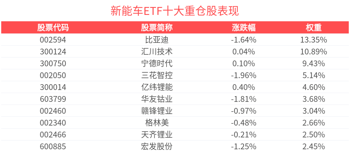 数据显示,截至2025年4月30日,中证新能源汽车产业指数(930997)前十大权重股分别为比亚迪(002594)、汇川技术(300124)、宁德时代(300750)、三花智控(002050)、亿纬锂能(300014)、华友钴业(603799)、赣锋锂业(002460)、格林美(002340)、天齐锂业(002466)、宏发股份(600885),前十大权重股合计占比58.64%。