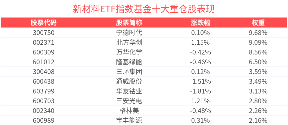 数据显示,截至2025年4月30日,中证新材料主题指数(H30597)前十大权重股分别为北方华创(002371)、宁德时代(300750)、万华化学(600309)、隆基绿能(601012)、三环集团(300408)、华友钴业(603799)、通威股份(600438)、三安光电(600703)、宝丰能源(600989)、格林美(002340),前十大权重股合计占比52.71%。