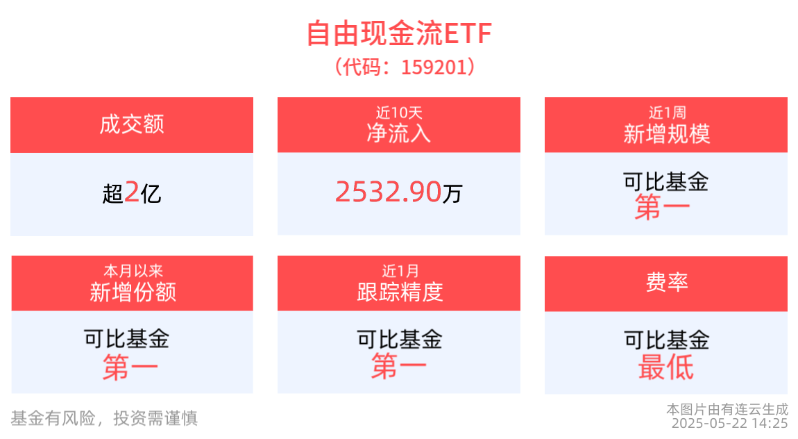 跟踪精度方面,截至2025年5月21日,自由现金流ETF近1月跟踪误差为0.007%,在可比基金中跟踪精度最高。