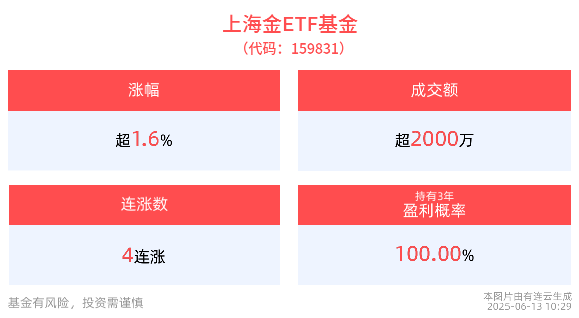 国际贵金属期货普遍收涨,COMEX黄金期货涨1.88%报3406.40美元/盎司,COMEX白银期货涨0.41%报36.41美元/盎司。截至2025年6月13日 10:29,上海金ETF基金(159831)上涨1.65%, 冲击4连涨。