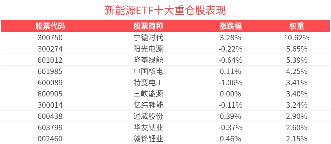 数据显示,截至2025年6月30日,中证新能源指数前十大权重股分别为宁德时代、阳光电源、隆基绿能、中国核电、三峡能源、特变电工、亿纬锂能、华友钴业、通威股份、赣锋锂业,前十大权重股合计占比42.81%。