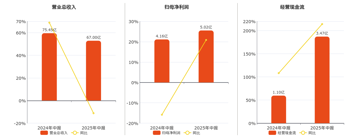 公司营业总收入为67.00亿元,较去年同报告期营业总收入减少8.45亿元,同比较去年同期下降11.20%。归母净利润为5.02亿元。经营活动现金净流入为3.47亿元。