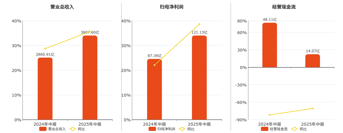 公司营业总收入为3607.60亿元。归母净利润为121.13亿元。经营活动现金净流入为14.07亿元,较去年同报告期经营活动现金净流入减少34.04亿元,同比较去年同期下降70.76%。