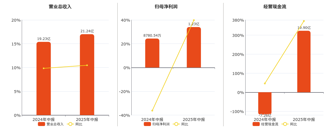 公司营业总收入为21.24亿元,在已披露的同业公司中排名第45。归母净利润为1.23亿元,在已披露的同业公司中排名第52。经营活动现金净流入为19.90亿元。