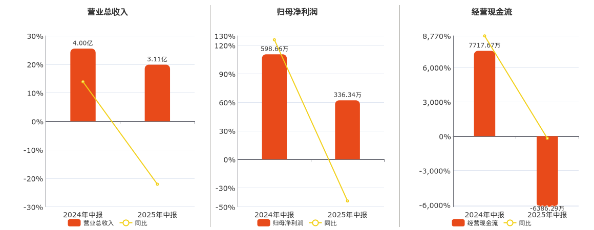 公司营业总收入为3.11亿元,在已披露的同业公司中排名第23,较去年同报告期营业总收入减少8825.62万元,同比较去年同期下降22.08%。归母净利润为336.34万元,在已披露的同业公司中排名第27,较去年同报告期归母净利润减少262.32万元,同比较去年同期下降43.82%。经营活动现金净流入为-6386.29万元,在已披露的同业公司中排名第25,较去年同报告期经营活动现金净流入减少1.41亿元,同比较去年同期下降182.75%。