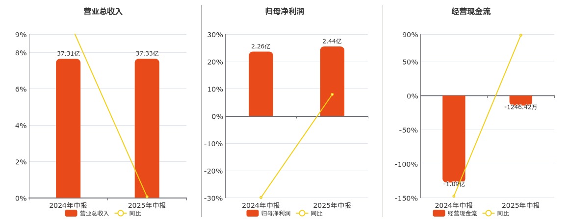 公司营业总收入为37.33亿元,在已披露的同业公司中排名第6,较去年同报告期营业总收入增加213.41万元,实现3年连续上涨,同比较去年同期上涨0.06%。归母净利润为2.44亿元,在已披露的同业公司中排名第6,较去年同报告期归母净利润增加1791.61万元,同比较去年同期上涨7.94%。经营活动现金净流入为-1246.42万元,较去年同报告期经营活动现金净流入增加9670.52万元。