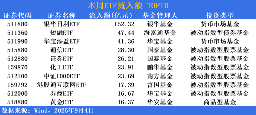 本期(2025年9月1日-9月4日),大资金对上涨较大的板块有所“恐高”,叠加周四市场遭遇强震荡,部分资金落袋为安意愿强烈,同时之前调整到位的防御类资产再度受到资金青睐。具体来看,债券、化工、黄金等均有大资金流入。银华日利ETF(511880)流入超150亿,位居流入榜榜首,短融 ETF(511360)、化工ETF(159870)、黄金ETF(518880)流入量居前。