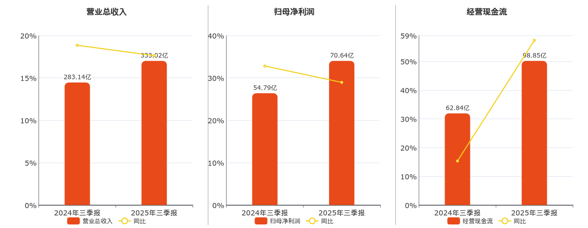 公司营业总收入为333.02亿元。归母净利润为70.64亿元。经营活动现金净流入为98.85亿元。