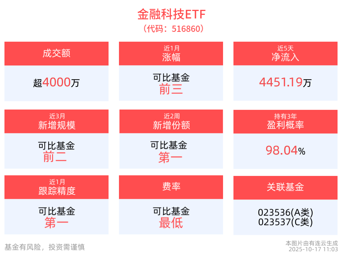流动性方面,金融科技ETF盘中换手1.85%,成交4513.62万元。拉长时间看,截至10月16日,金融科技ETF近1月日均成交2.59亿元,居可比基金前2。
