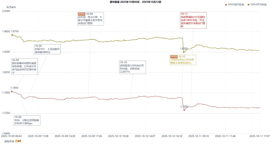 十月前后债市再度迎来黑天鹅事件,在关税博弈升温下,债市迎来交易修复窗口,股债短期波动或难免,避险交易成为新主题。具体而言,节前29日股市上涨动能强,债市情绪脆弱继续调整;30日央行万亿买断式回购呵护流动性,9月债市整体关门红;节后9日假期多项数据不及预期,债市10月开门红;10日股债开门红后今日双双走弱,债市情绪仍受压制;11日市场避险情绪意外升温,债市迎来久违突破契机。上周走势复盘如下图所示。