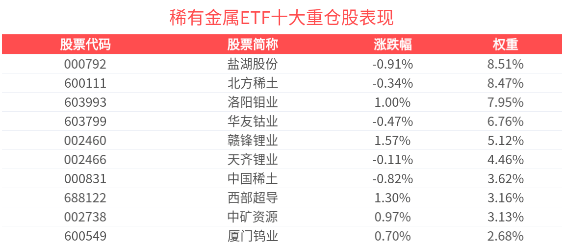 数据显示,截至2025年9月30日,中证稀有金属主题指数前十大权重股分别为北方稀土、洛阳钼业、华友钴业、盐湖股份、赣锋锂业、天齐锂业、中国稀土、中矿资源、盛和资源、西部超导,前十大权重股合计占比59.91%。