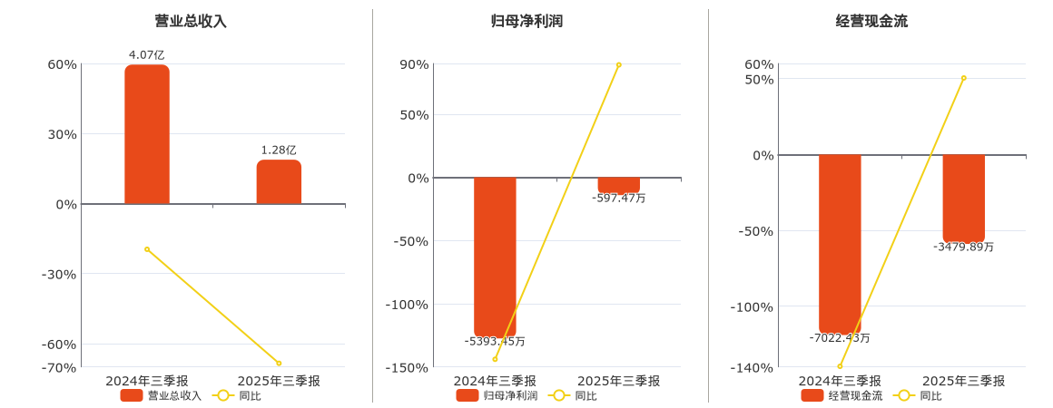 公司营业总收入为1.28亿元,较去年同报告期营业总收入减少2.78亿元,同比较去年同期下降68.47%。归母净利润为-597.47万元。经营活动现金净流入为-3479.89万元。