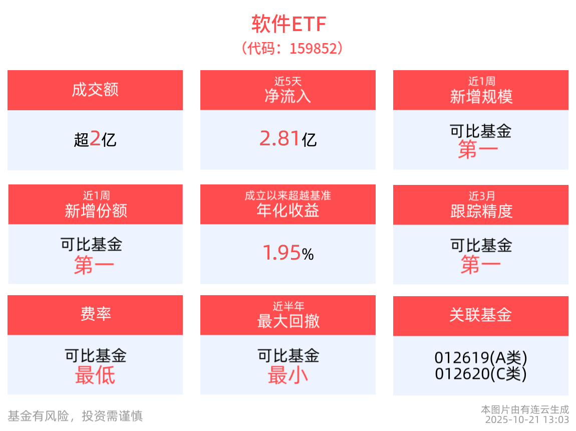 流动性方面,软件ETF盘中换手4.63%,成交2.67亿元。规模方面,软件ETF近1周规模增长7765.42万元,实现显著增长,新增规模位居可比基金第一。份额方面,软件ETF近1周份额增长2.66亿份,实现显著增长,新增份额位居可比基金第一。