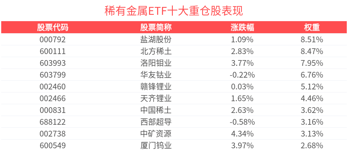 数据显示,截至2025年9月30日,中证稀有金属主题指数前十大权重股分别为北方稀土、洛阳钼业、华友钴业、盐湖股份、赣锋锂业、天齐锂业、中国稀土、中矿资源、盛和资源、西部超导,前十大权重股合计占比59.91%。