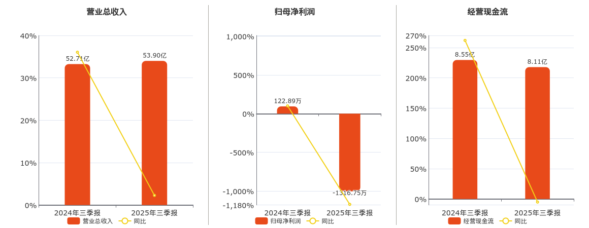 公司营业总收入为53.90亿元,较去年同报告期营业总收入增加1.19亿元,实现4年连续上涨,同比较去年同期上涨2.27%。归母净利润为-1316.75万元,较去年同报告期归母净利润减少1439.64万元,同比较去年同期下降1171.47%。经营活动现金净流入为8.11亿元,较去年同报告期经营活动现金净流入减少4388.86万元,同比较去年同期下降5.13%。