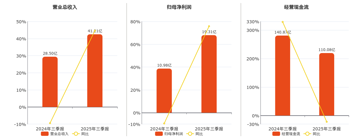 公司营业总收入为41.21亿元,较去年同报告期营业总收入增加12.71亿元,同比较去年同期上涨44.61%。归母净利润为19.31亿元,较去年同报告期归母净利润增加8.33亿元,同比较去年同期上涨75.83%。经营活动现金净流入为110.08亿元。