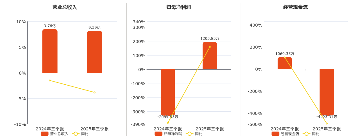 公司营业总收入为9.39亿元。归母净利润为1205.85万元,较去年同报告期归母净利润增加3250.38万元。经营活动现金净流入为-4223.31万元。
