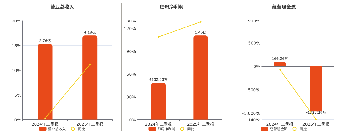 公司营业总收入为4.18亿元,在已披露的同业公司中排名第28。归母净利润为1.45亿元。经营活动现金净流入为-1723.29万元,在已披露的同业公司中排名第23,较去年同报告期经营活动现金净流入减少1889.65万元,同比较去年同期下降1135.90%。