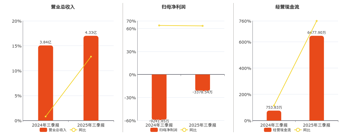 公司营业总收入为4.33亿元,在已披露的同业公司中排名第42。归母净利润为-3378.54万元,在已披露的同业公司中排名第45。经营活动现金净流入为6477.90万元,在已披露的同业公司中排名第30。