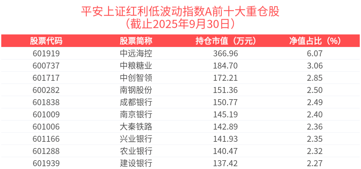 平安上证红利低波动指数A紧密跟踪上红低波指数,上证红利低波动指数选取50只流动性好、连续分红、红利支付率适中、每股股息正增长以及股息率高且波动率低的证券作为指数样本,采用股息率加权,以反映分红水平高且波动率低的证券的整体表现。 截止2025年9月30日,平安上证红利低波动指数A指数基金前十大重仓股分别为中远海控、中粮糖业、中创智领、南钢股份、成都银行等,前十大权重股合计占比28.67%。