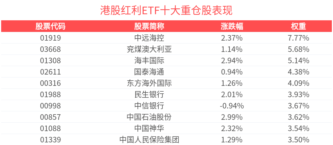 数据显示,截至2025年10月31日,中证港股通高股息投资指数前十大权重股分别为中远海控、兖煤澳大利亚、海丰国际、东方海外国际、中国石油股份、中信银行、国泰海通、中国神华、民生银行、中国人民保险集团,前十大权重股合计占比46.3%。