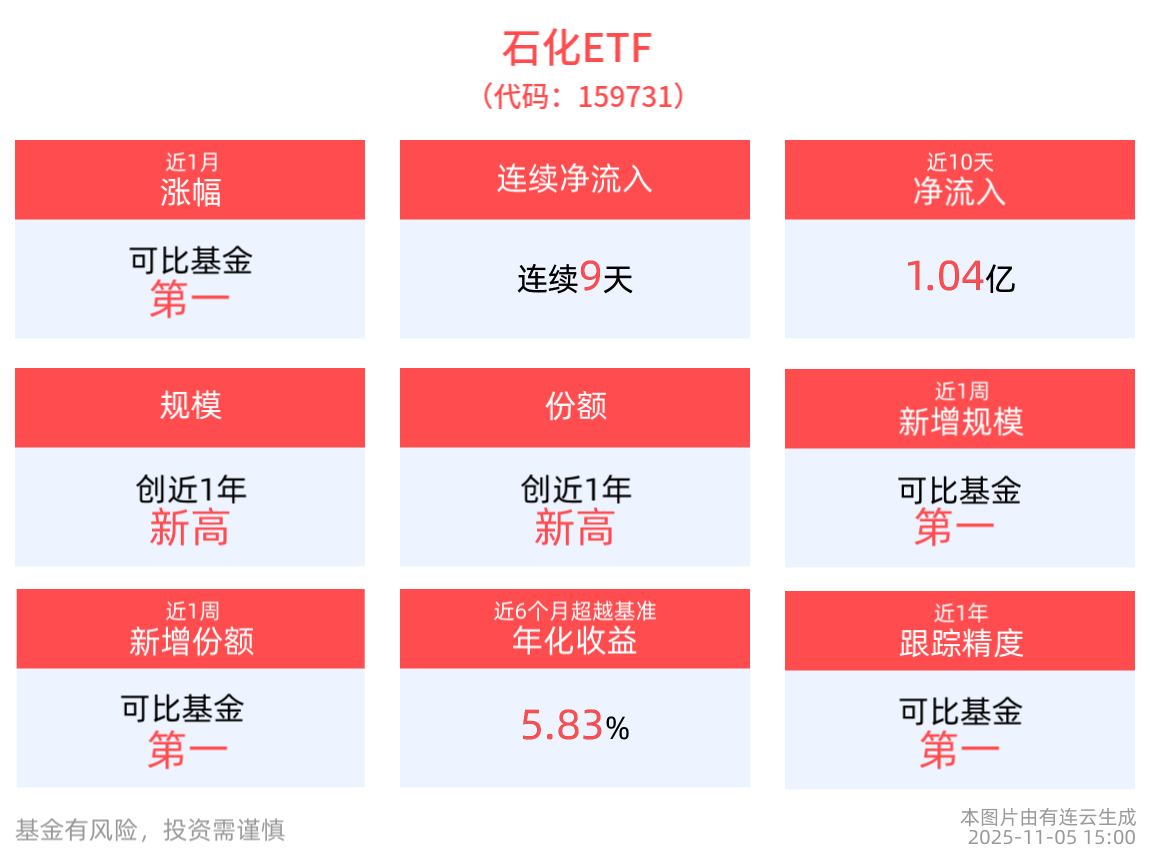 跟踪精度方面,截至2025年11月5日,石化ETF近1年跟踪误差为0.037%,在可比基金中跟踪精度最高。