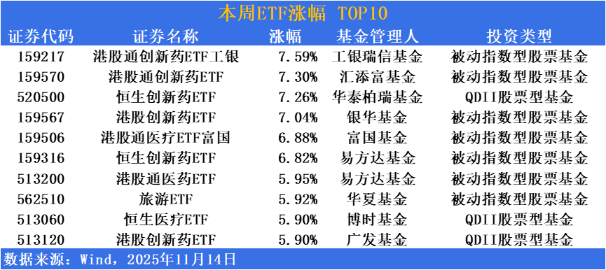 本周创新药相关ETF开启反攻。涨幅前十的ETF创新药占据9席。港股通创新药ETF工银(159217)、港股通创新药ETF(159570)等多支产品涨幅超7%;港股通医疗ETF富国(159506)、恒生创新药ETF(520500)等多支产品涨幅超6%。