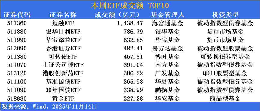 成交额方面,短融ETF(511360)周成交额破千亿,达1438.47亿,位居列周成交榜首位;银华日利ETF(511880)、华宝添益ETF(511990)周成交额达786.79亿、632.85亿,分居二、三,债券类基金场内交投保持较高活跃度。