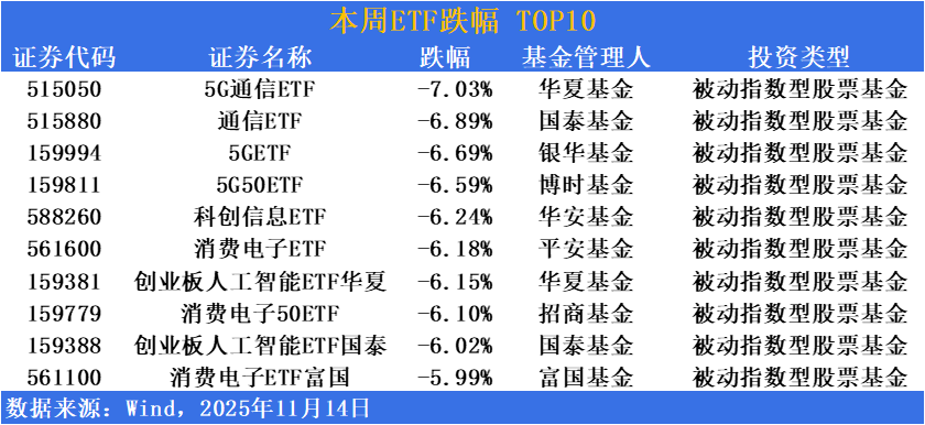 随着三季报披露全面收官,前期涨幅较大的板块进入消化估值阶段,市场整体显现出风险再平衡的迹象。前期表现强势的通信、电子等“新质生产力”相关板块则延续调整态势,反映在市场上,通信、AI相关ETF本周继续回调