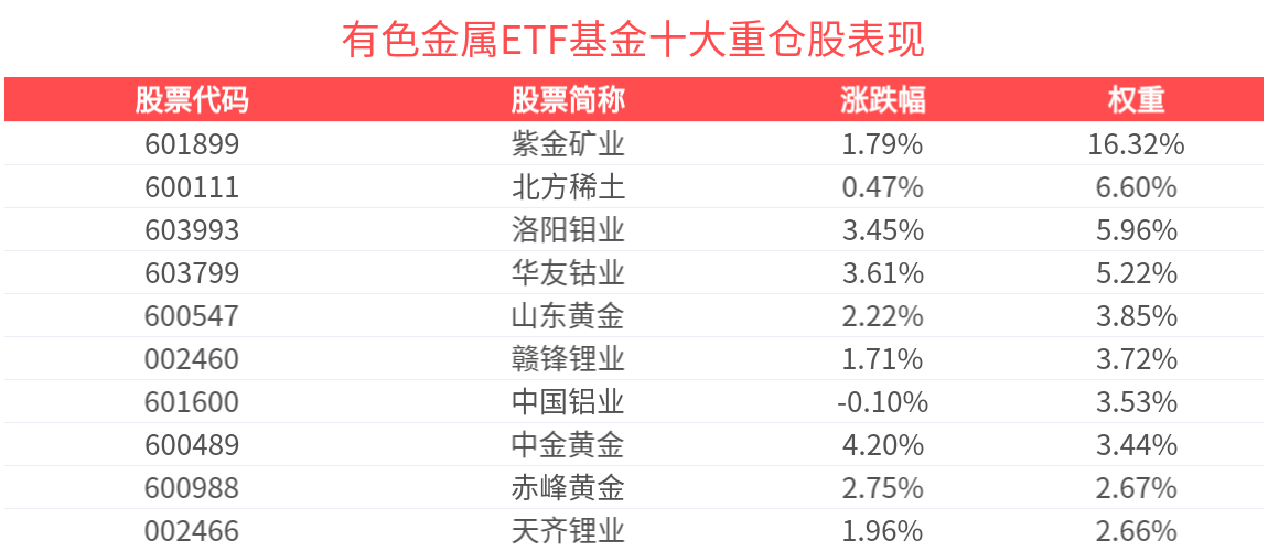 有色金属ETF基金紧密跟踪中证细分有色金属产业主题指数,截至2025年10月31日,指数前十大权重股分别为紫金矿业、北方稀土、洛阳钼业、华友钴业、中国铝业、赣锋锂业、山东黄金、中金黄金、天齐锂业、赤峰黄金,前十大权重股合计占比53.58%。(以上所列股票仅为指数成份股,无特定推荐之意)