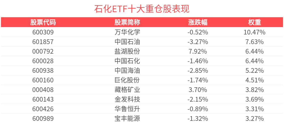 石化ETF紧密跟踪中证石化产业指数,数据显示,截至2025年12月31日,中证石化产业指数前十大权重股分别为万华化学、中国石油、中国石化、盐湖股份、中国海油、藏格矿业、巨化股份、恒力石化、华鲁恒升和宝丰能源,前十大权重股合计占比56.73%。