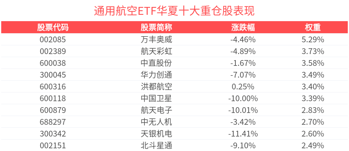 通用航空ETF华夏紧密跟踪国证通用航空产业指数,截至2025年12月31日,国证通用航空产业指数(980076)前十大权重股分别为万丰奥威、航天彩虹、中直股份、华力创通、中国卫星、洪都航空、航天电子、中无人机、天银机电、北斗星通,前十大权重股合计占比33.92%。(以上所列股票仅为指数成份股,无特定推荐之意)