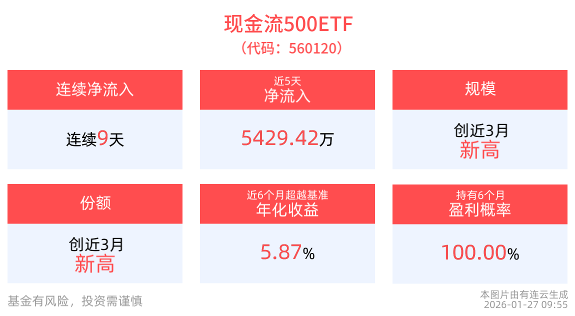 截至1月26日,现金流500ETF近6月净值上涨42.56%。从收益能力看,截至2026年1月26日,现金流500ETF自成立以来,最高单月回报为7.97%,最长连涨月数为3个月,最长连涨涨幅为15.21%,涨跌月数比为4/1,上涨月份平均收益率为5.34%,月盈利百分比为80%,月盈利概率为88.35%,历史持有6个月盈利概率为100%。