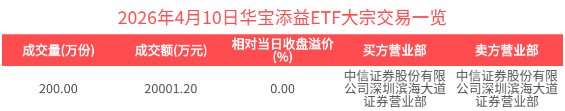 ETF大宗榜 | 华宝添益ETF(511990):获大宗交易溢价买入2.00亿元,居全市场第一-20260410