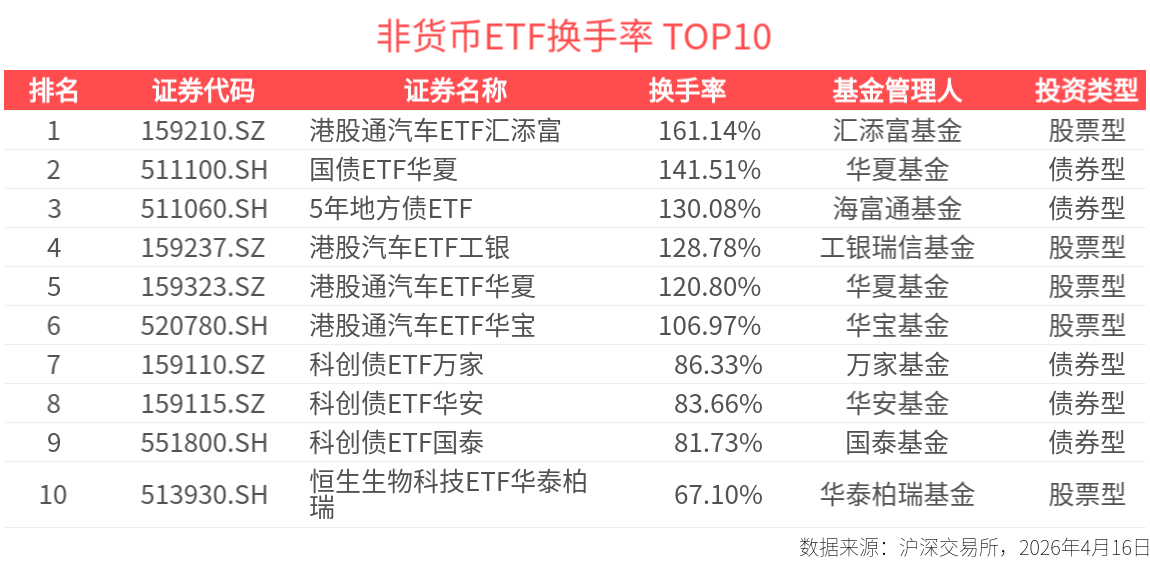 ETF热门榜:中证短融相关ETF成交居前,港股通汽车ETF汇添富(159210.SZ)交易活跃-20260416