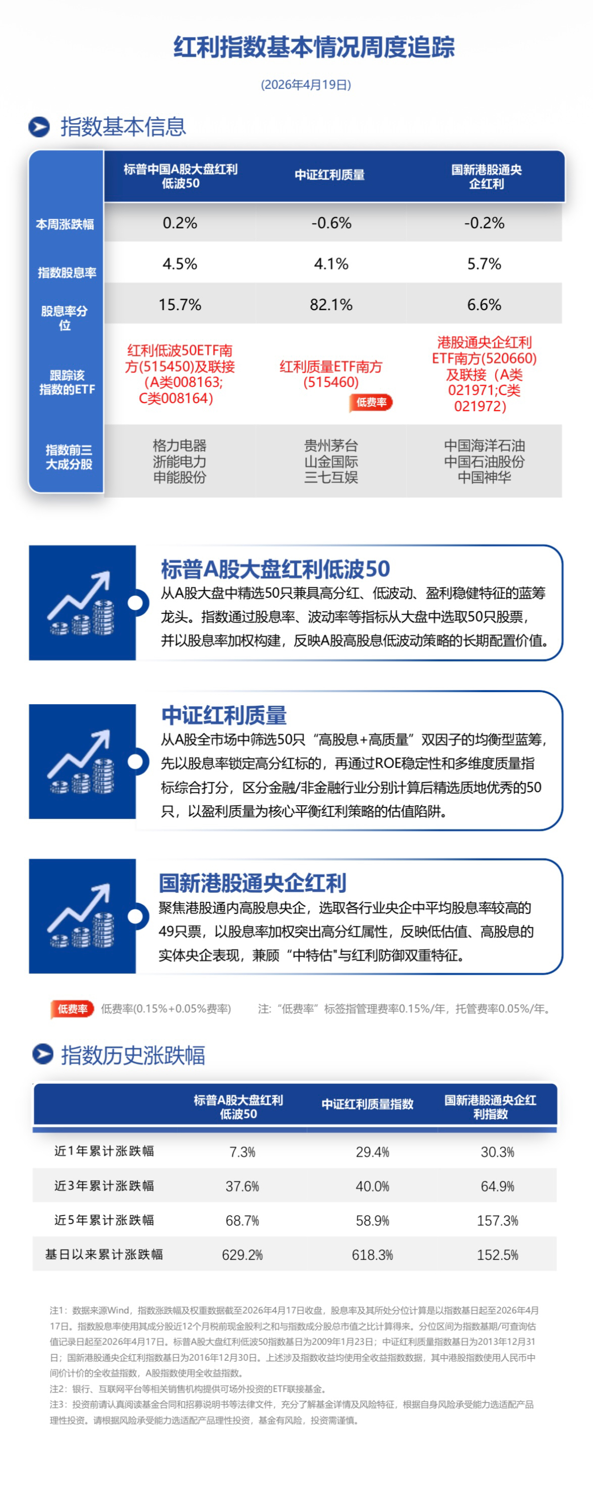 截至本周五收盘,红利低波50ETF南方(515450)跟踪标的标普A股大盘红利低波50本周上涨0.2%;红利质量ETF南方(515460)跟踪标的中证红利质量收跌0.6%;港股通央企红利ETF南方(520660)跟踪标的国新港股通央企红利收跌0.2%。