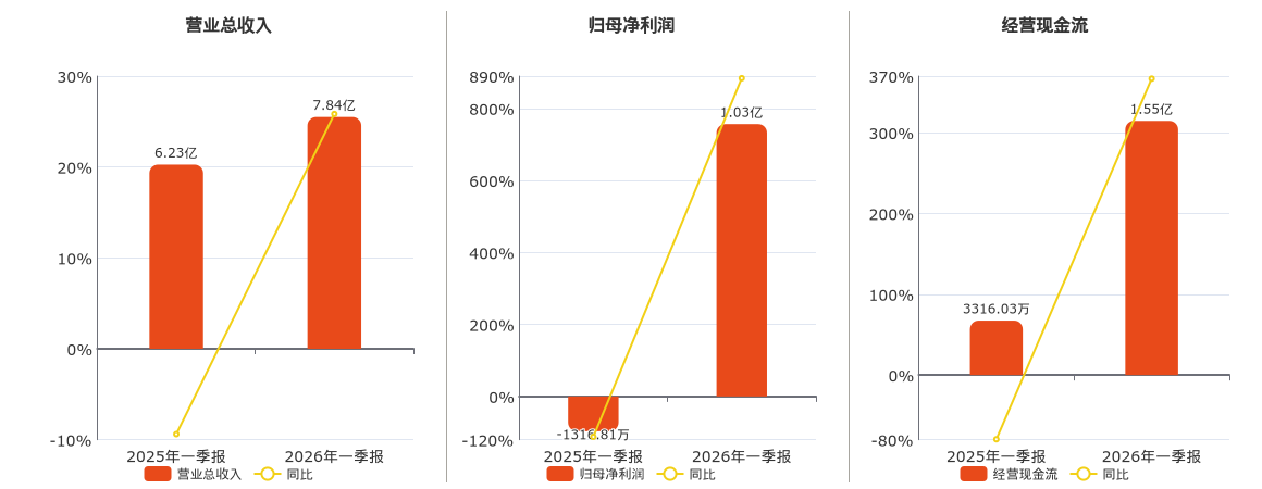 公司营业总收入为7.84亿元,较去年同报告期营业总收入增加1.61亿元,同比较去年同期上涨25.83%。归母净利润为1.03亿元,较去年同报告期归母净利润增加1.16亿元。经营活动现金净流入为1.55亿元,较去年同报告期经营活动现金净流入增加1.22亿元,同比较去年同期上涨366.85%。