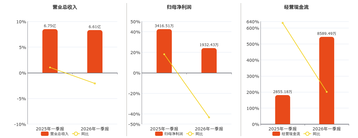 公司营业总收入为6.61亿元,较去年同报告期营业总收入减少1405.04万元,同比较去年同期下降2.08%。归母净利润为1932.43万元,较去年同报告期归母净利润减少1484.08万元,同比较去年同期下降43.44%。经营活动现金净流入为8589.49万元。