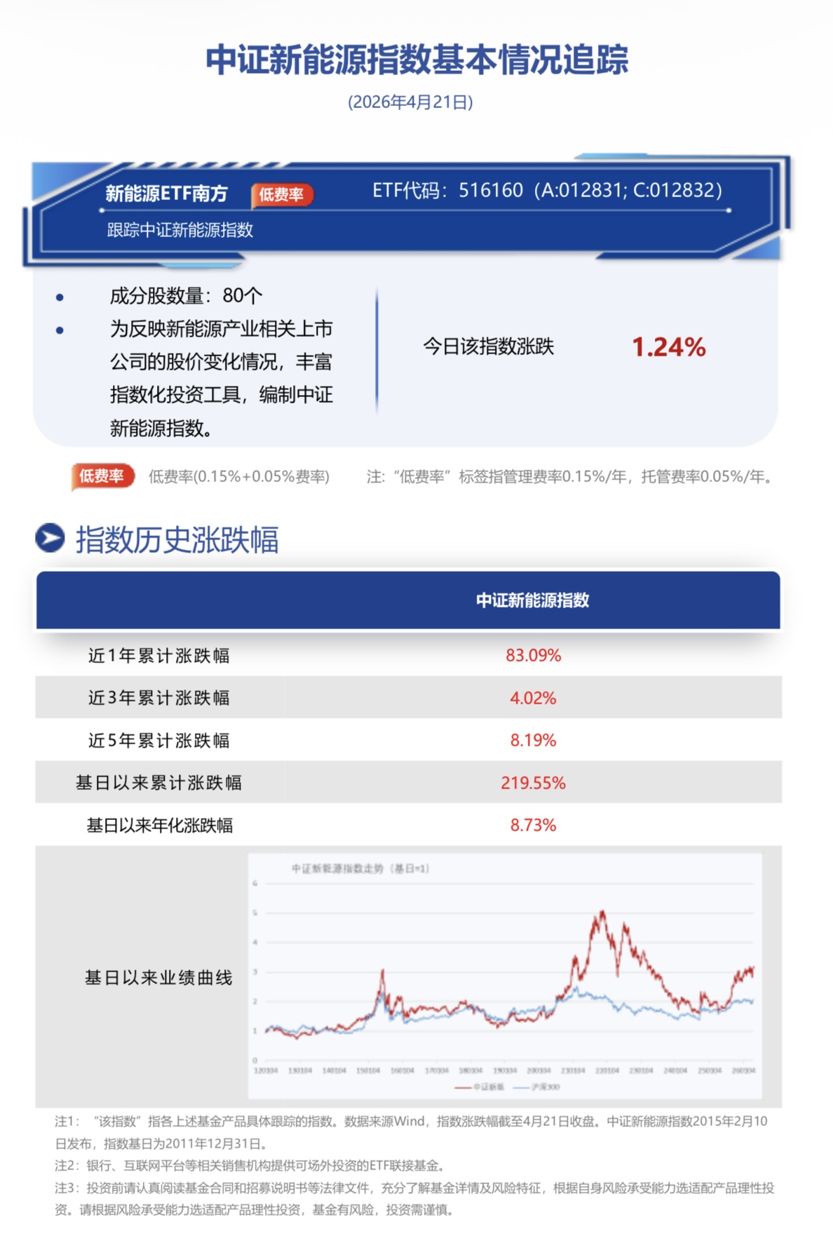 截至2026年4月21日收盘,新能源ETF南方(516160)换手4.99%,成交3.95亿元,跟踪标的指数中证新能源指数(399808.SZ) 涨1.24%。