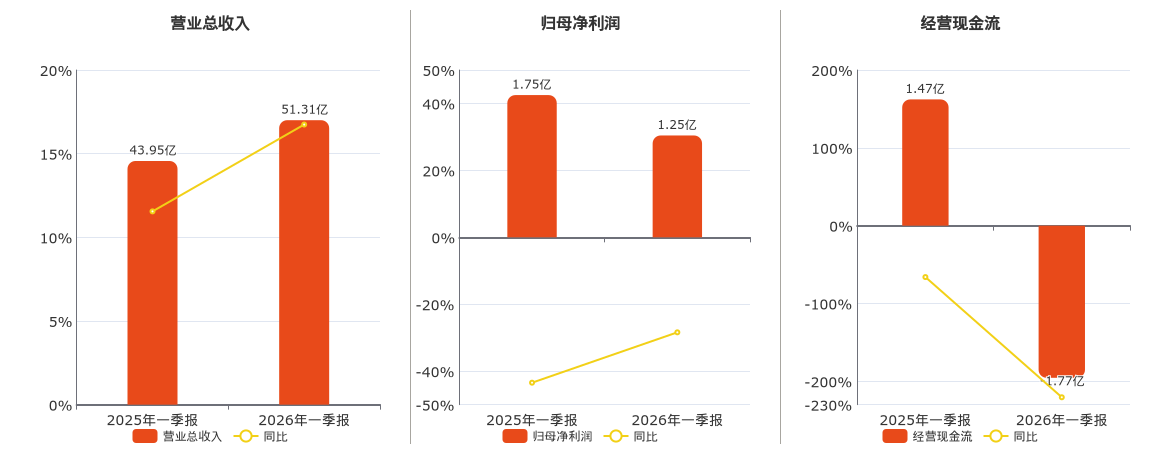 公司营业总收入为51.31亿元,较去年同报告期营业总收入增加7.36亿元,实现3年连续上涨,同比较去年同期上涨16.74%。归母净利润为1.25亿元。经营活动现金净流入为-1.77亿元。