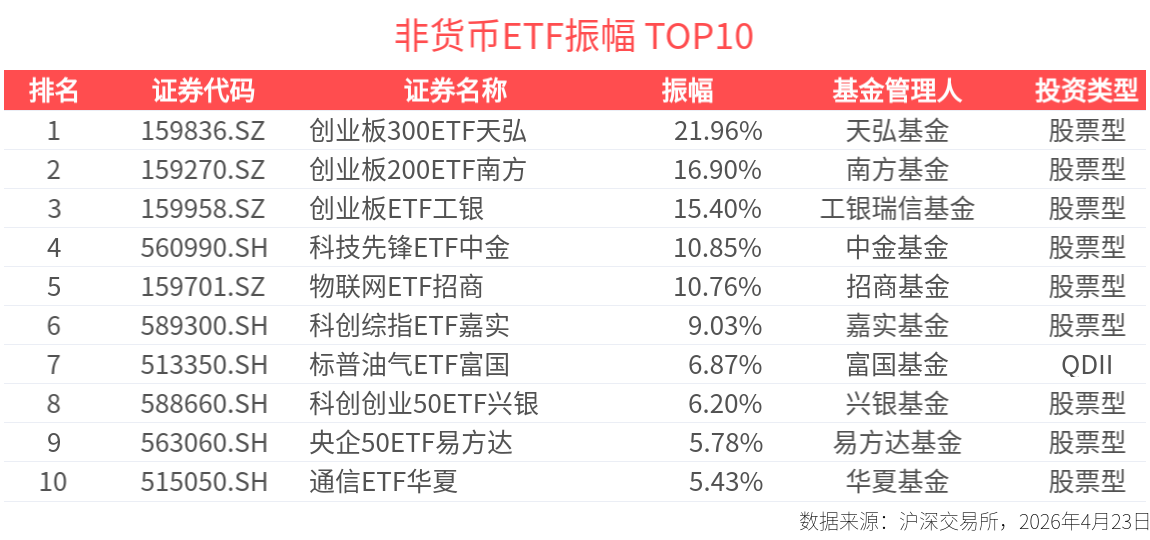 2026年4月23日,非货币类ETF合计成交4169.44亿元,其中有87只ETF成交额破10亿元。