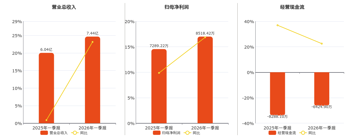 公司营业总收入为7.44亿元。归母净利润为8518.42万元。经营活动现金净流入为-6424.90万元。