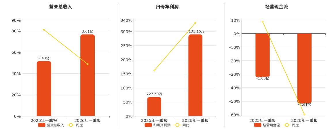 公司营业总收入为3.61亿元。归母净利润为3131.16万元。经营活动现金净流入为-1.61亿元,较去年同报告期经营活动现金净流入减少6014.11万元。