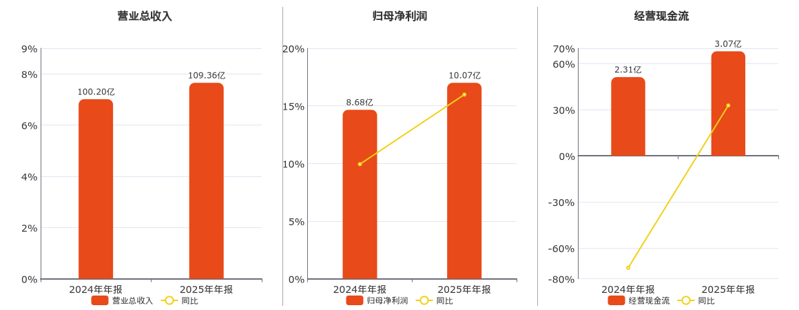 公司营业总收入为109.36亿元。归母净利润为10.07亿元。经营活动现金净流入为3.07亿元。