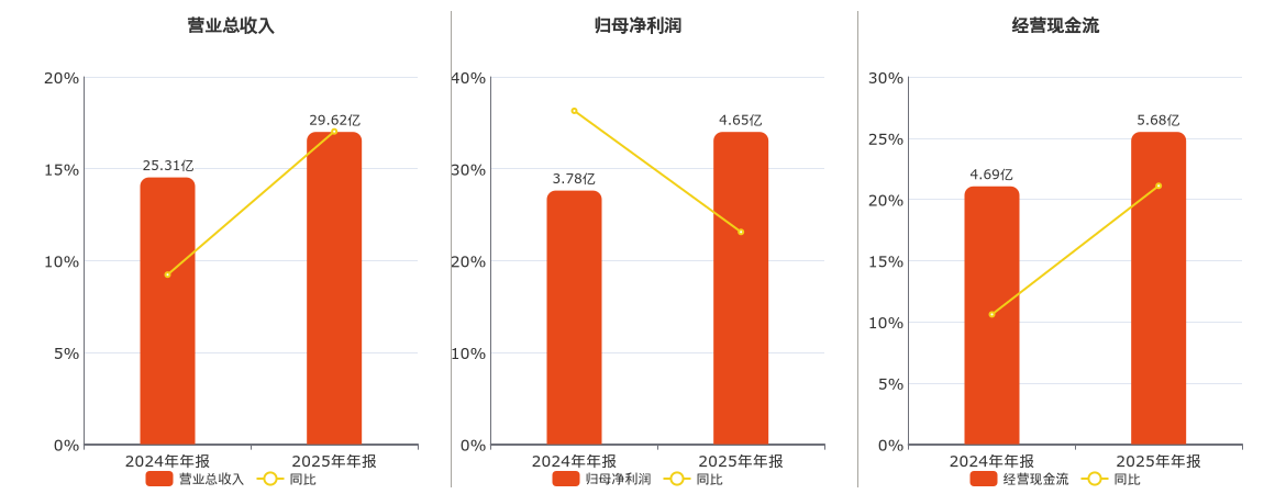公司营业总收入为29.62亿元。归母净利润为4.65亿元。经营活动现金净流入为5.68亿元。