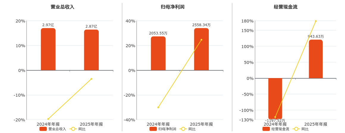公司营业总收入为2.87亿元,较去年同报告期营业总收入减少1050.88万元,同比较去年同期下降3.53%。归母净利润为2558.34万元。经营活动现金净流入为943.63万元。