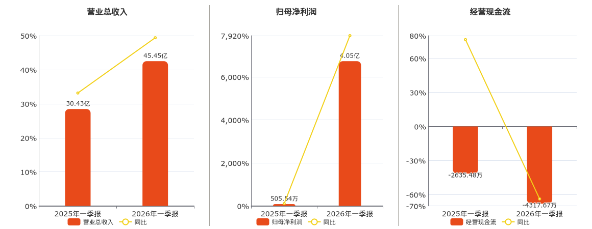 公司营业总收入为45.45亿元。归母净利润为4.05亿元。经营活动现金净流入为-4317.67万元,较去年同报告期经营活动现金净流入减少1682.19万元。